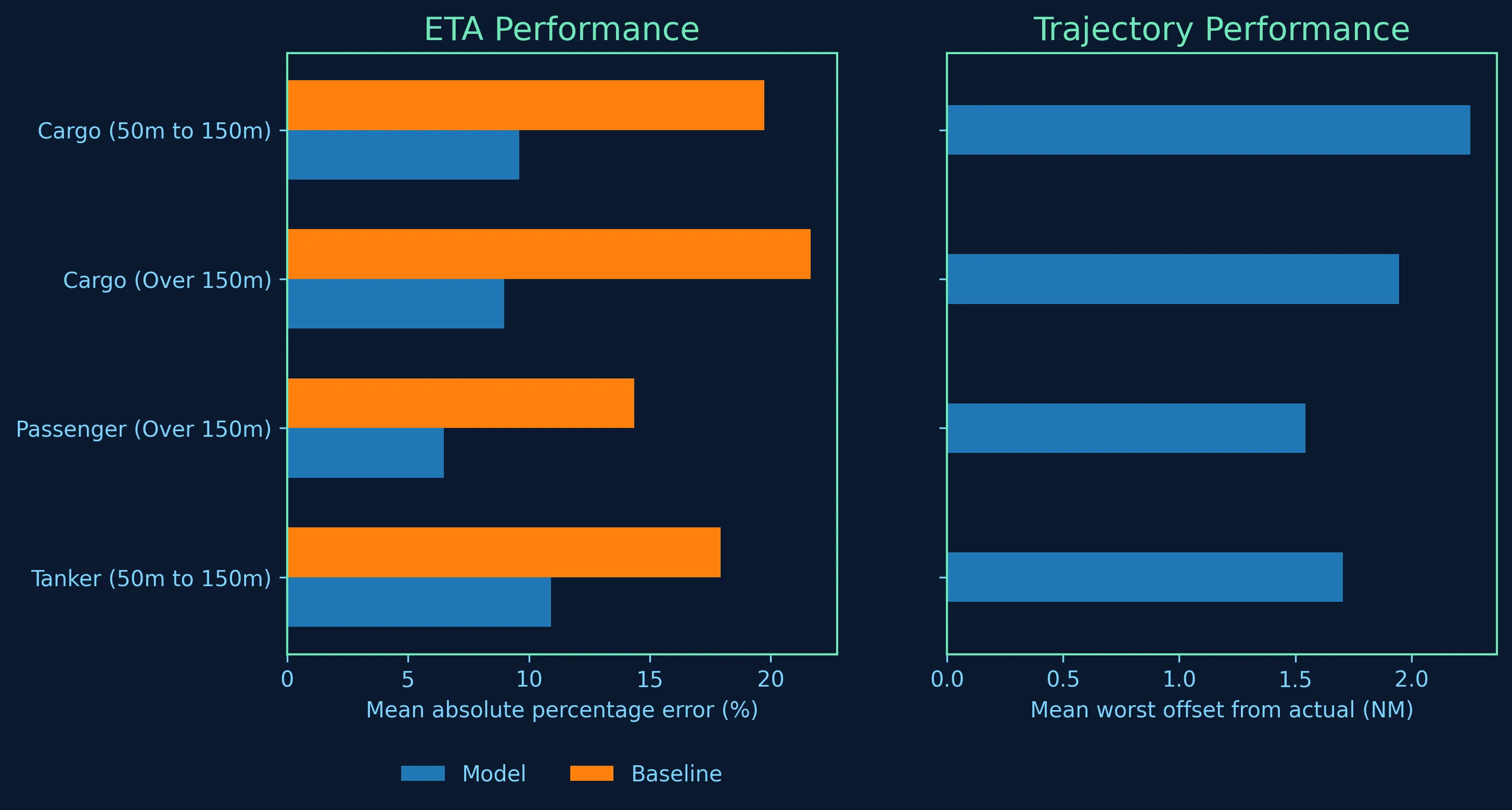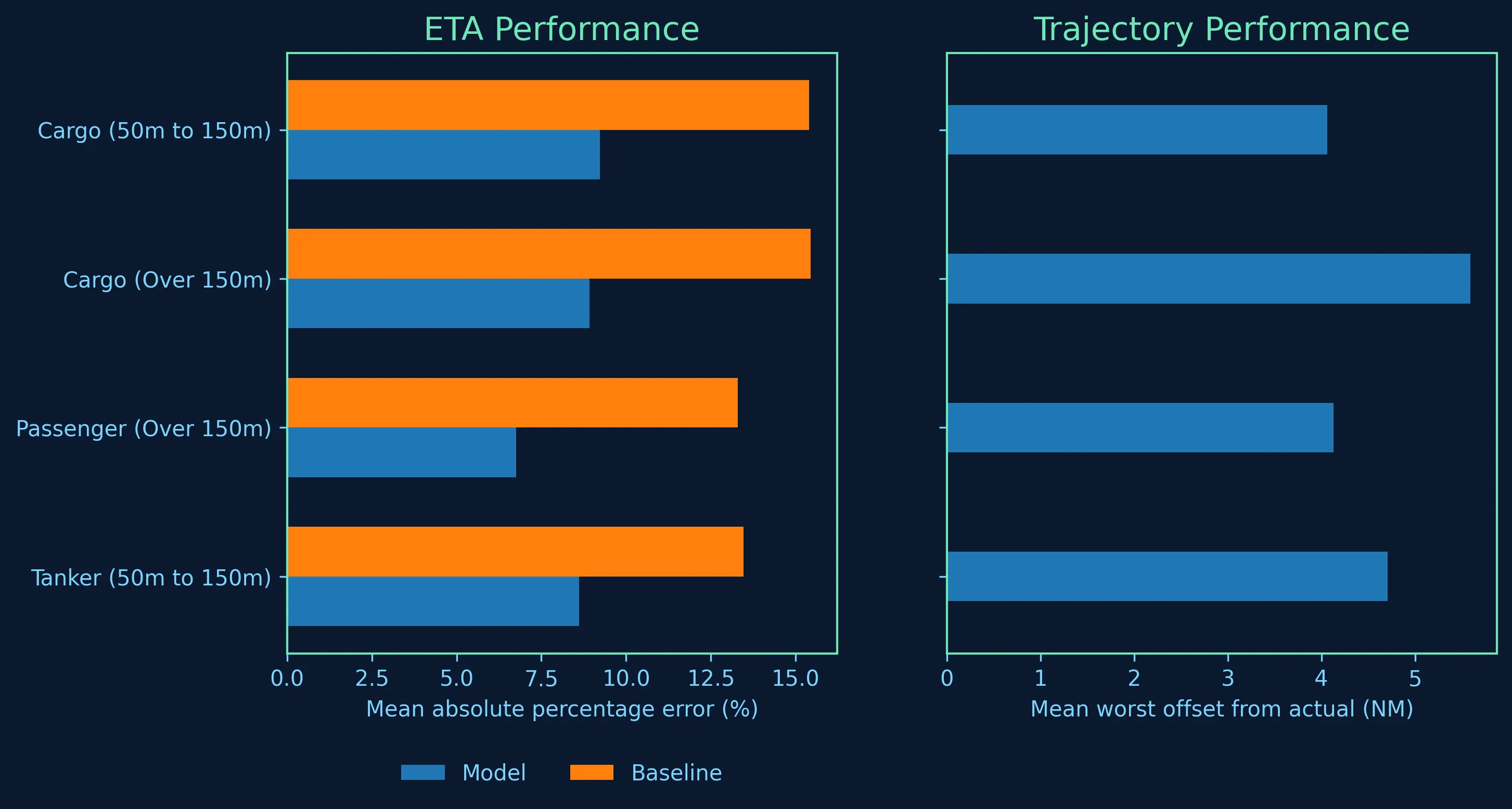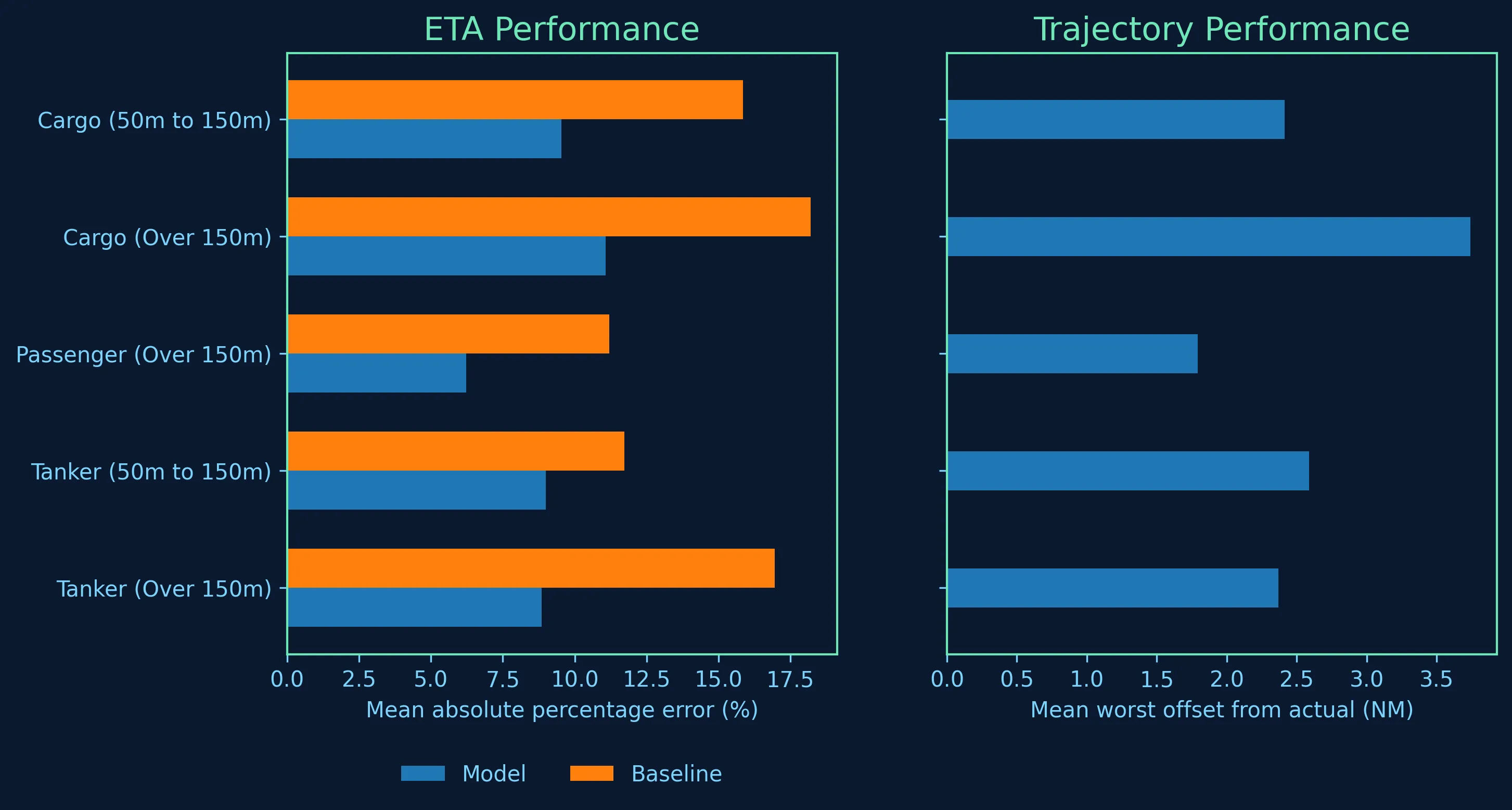 Every model is validated against thousands of real vessel transits before deployment, with results aggregated for robust evaluation. Each model is benchmarked on two tasks: